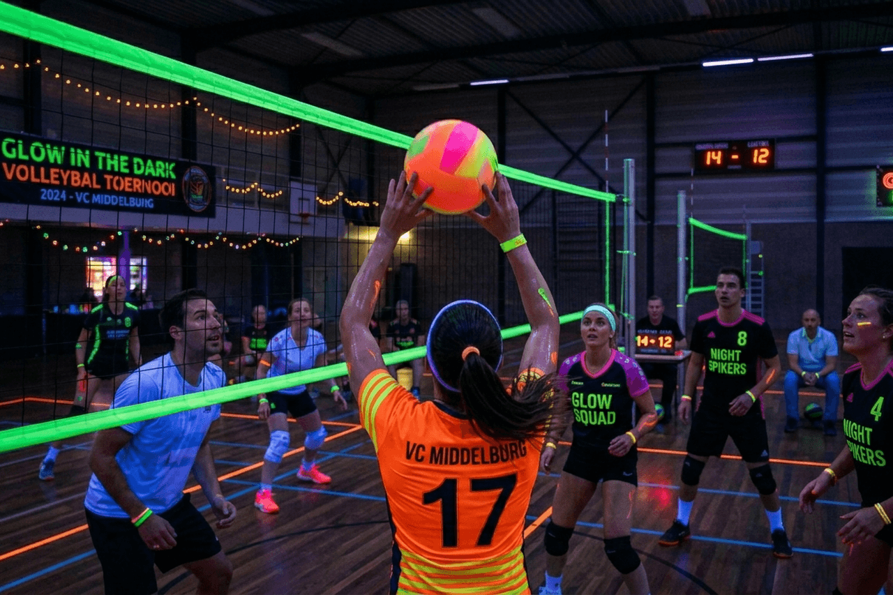 Glow in the dark volleybal zorgt voor een spectaculaire beleving waarbij het spel, de spelers en het net extra opvallen onder blacklight. Door de snelheid van het spel en het gebruik van een bal in de lucht komt het effect hier vaak nog beter tot zijn recht.