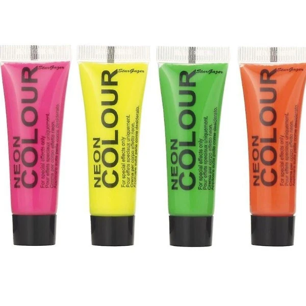 Deze set bestaat uit vier tubes bodyverf: oranje, geel, groen en roze. Met deze bodyverf heb je alle neon kleuren in fluoriserende kleur in huis voor een aantrekkelijke prijs, perfect te combineren met onze blacklight sets.