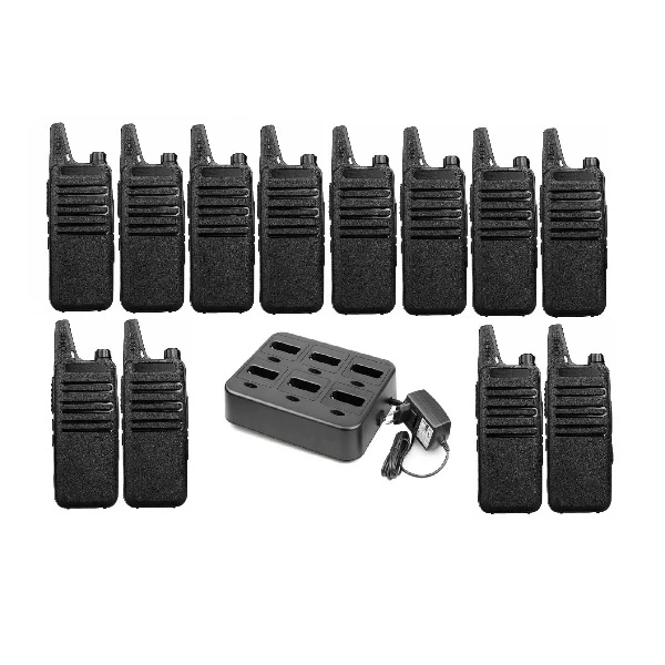 De set bestaat uit 12 semi professionele walkie talkies inclusief een multi lader waarin je de portofoons allemaal op één station kunt opladen.