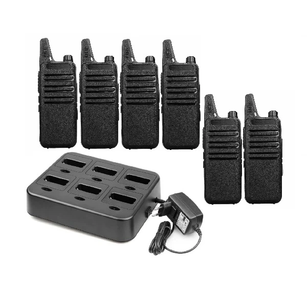 De set bestaat uit 6 semi professionele walkie talkies inclusief een multi lader waarin je de portofoons allemaal op één station kunt opladen.