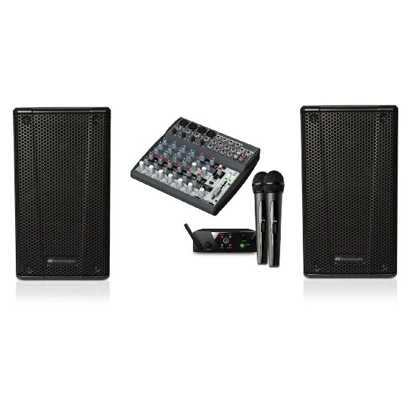 Deze presentatieset is geschikt tot ongeveer 100 personen, dit is uiteraard afhankelijk van omstandigheden, zoals omgevingsgeluid en of je het buiten gebruikt. Wij leveren deze set met twee semi professionele speakers samen met een mengpaneel en een draadloze microonset. Het voordeel hiervan is dat je met twee draadloze microfoons kan speachen en je kunt ook nog tegelijkertijd audio afspelen door de meegeleverde aux kabel.